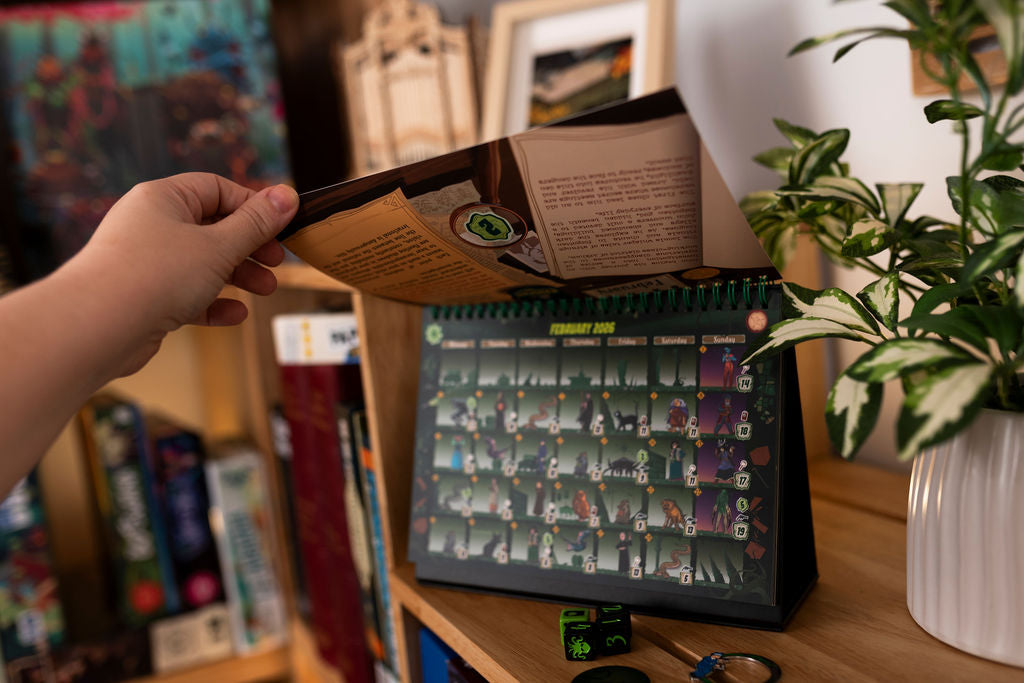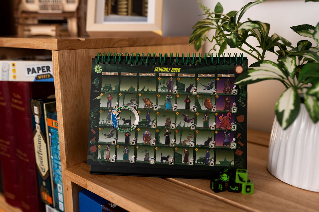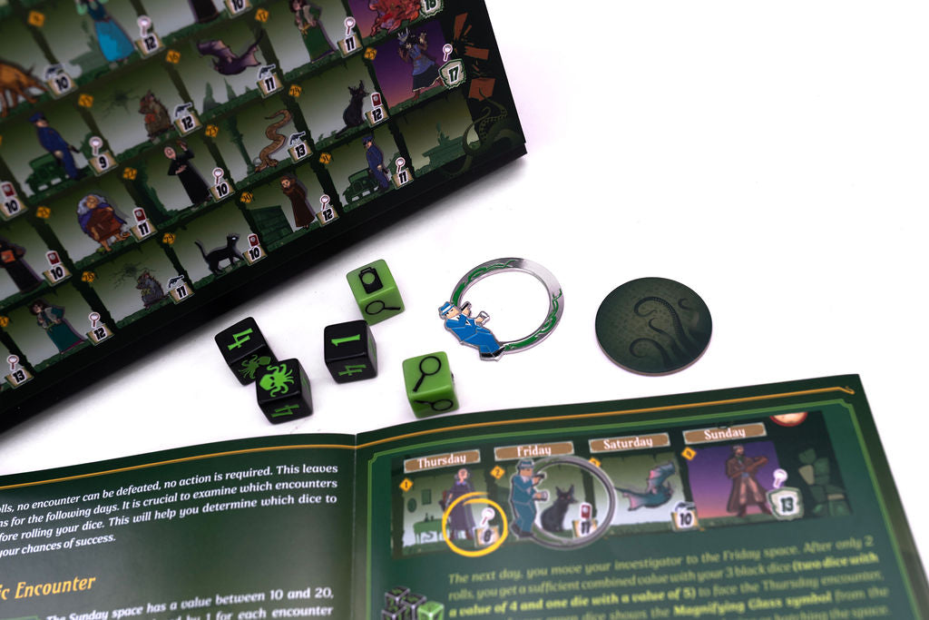Move your investigator to the current day, roll dice to confront haunting encounters, and gather clues and cursed artifacts. As each month ends, record your score and uncover new rules that twist the game in unexpected ways!