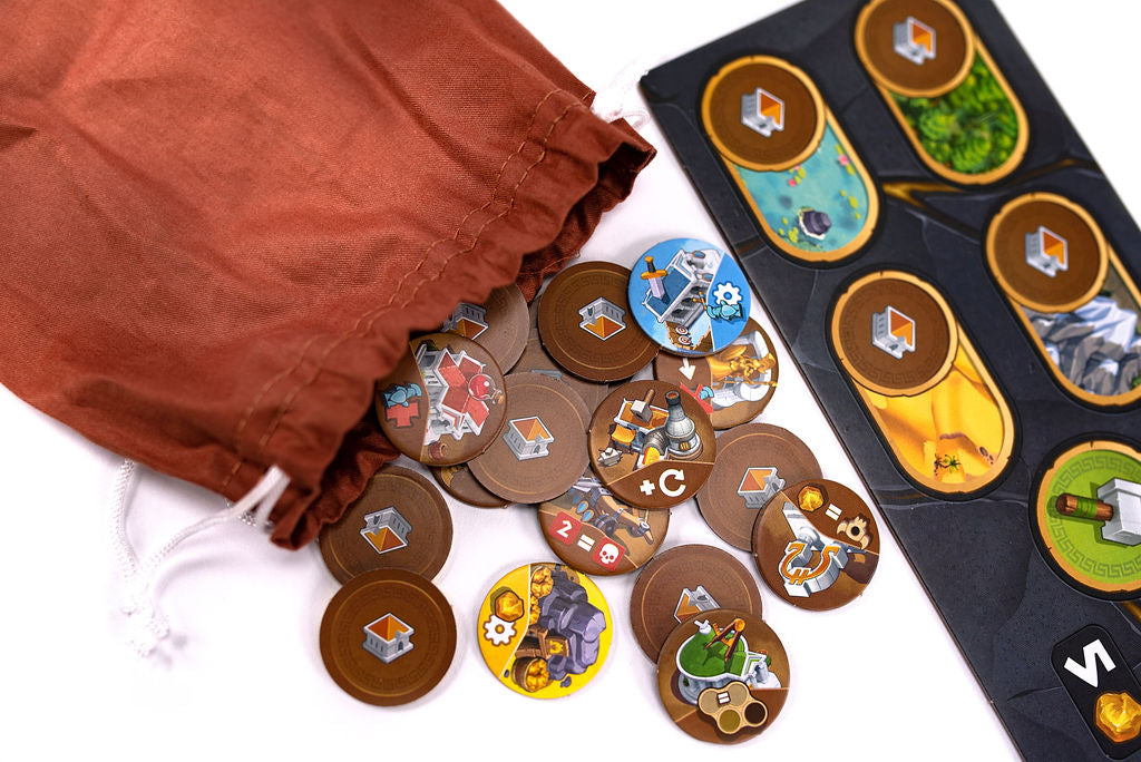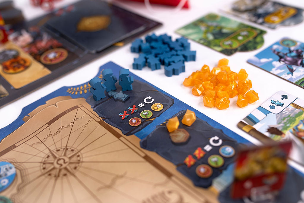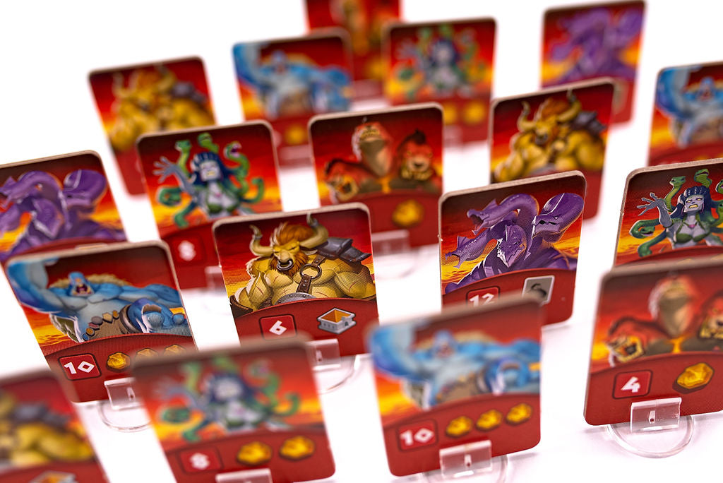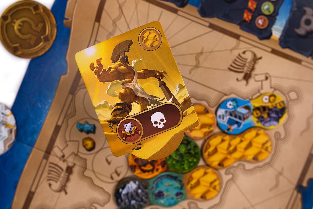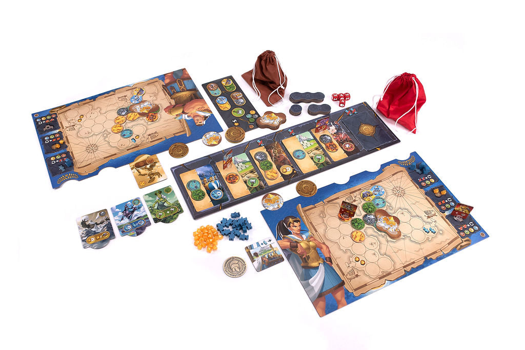 Orichalcum is a race against your opponents. Whoever is the first to collect 5 Victory Points above their board and eliminate all Creatures on their island will be the winner! There are three ways to earn victory points: draw the attention of Titans, erect Temples, and forge previous Orichalque medallions -- that legendary metal that only the Atlantes know how to extract.