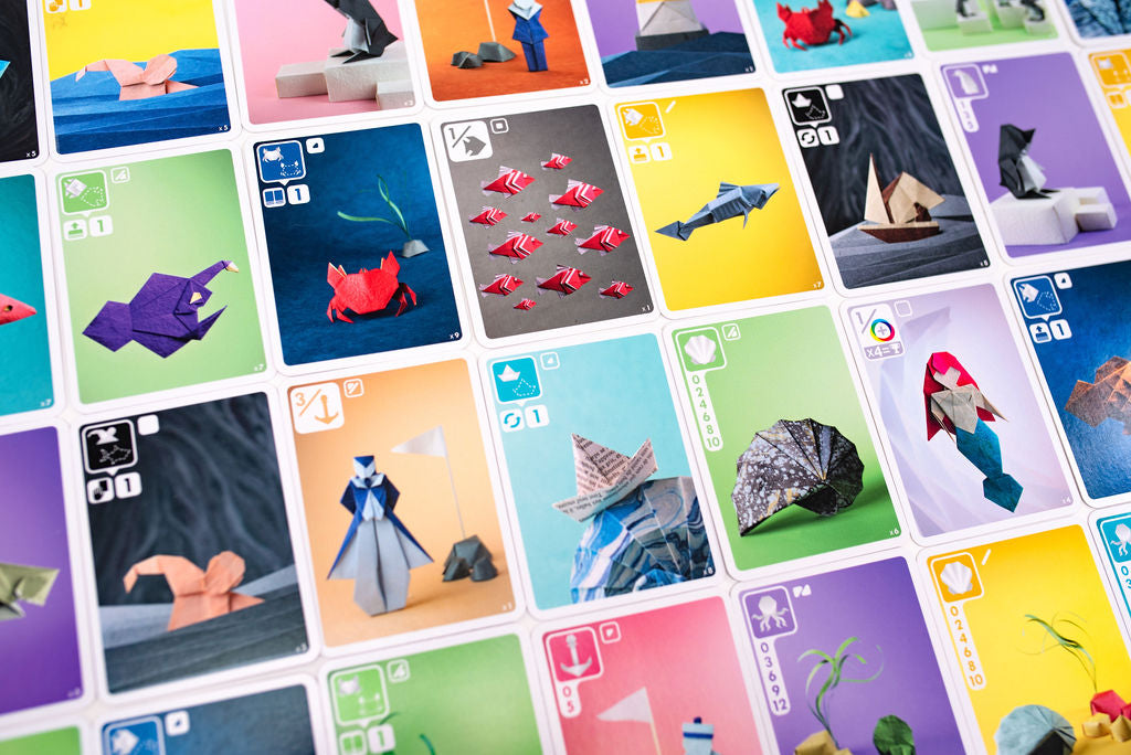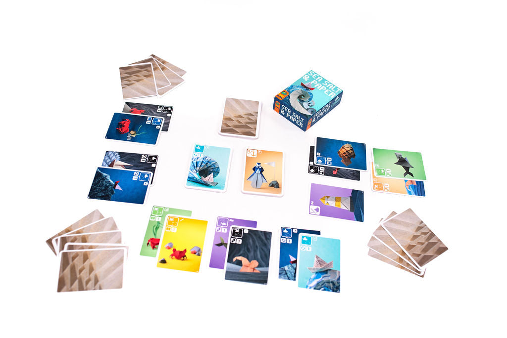 In Sea Salt & Paper players are trying to manage their hand and collect sets of cards. On your turn you may either draw 2 cards from the deck, keep 1, and discard the other face up, or take the topmost card of 1 discard pile. You may then play matching pairs from your hand to take special effects like stealing a card from your opponent or taking another turn.