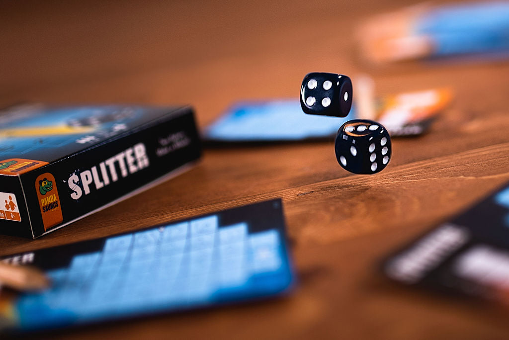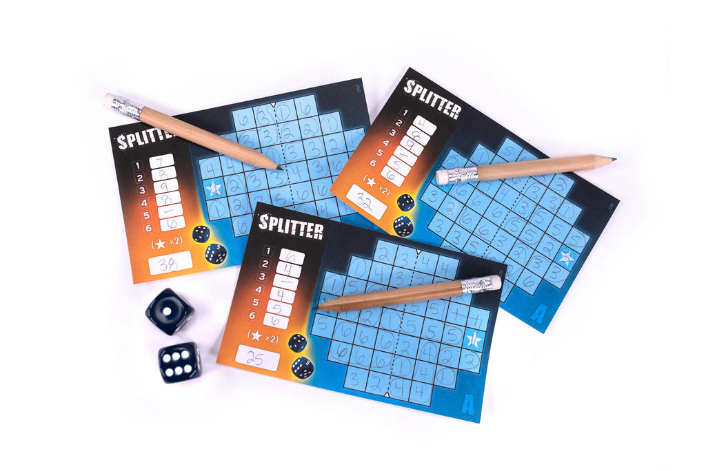Splitter promises a whole new challenge with simple rules and a dash of symmetry. In each round, 2 dice are rolled. Then everyone has to write the results on their page trying their best to group the same numbers together.