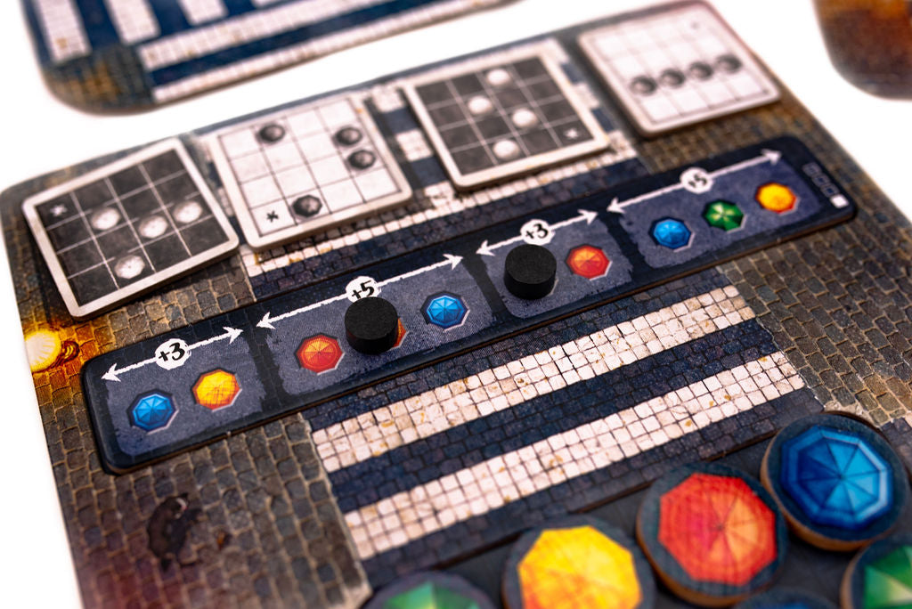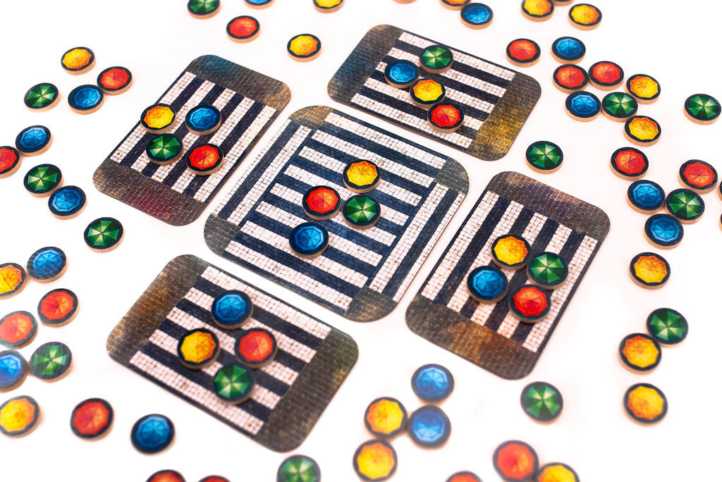 In this abstract strategy game, players aim to complete Figures using 4 Umbrellas of the same color. They slide Umbrellas from Waiting Zones onto their 4x4 grid, consequently sliding Umbrellas off of their Stage. After sliding, if their Stage matches a Figure Tile, they place a token on their scoring board and cover up the color used to complete it. They then pass the completed Figure Tile to the next player. The game end is triggered in 3 different ways, and points are earned through scoring tokens, bonuses, and empty Personal Waiting Zones. The player with the most points wins!